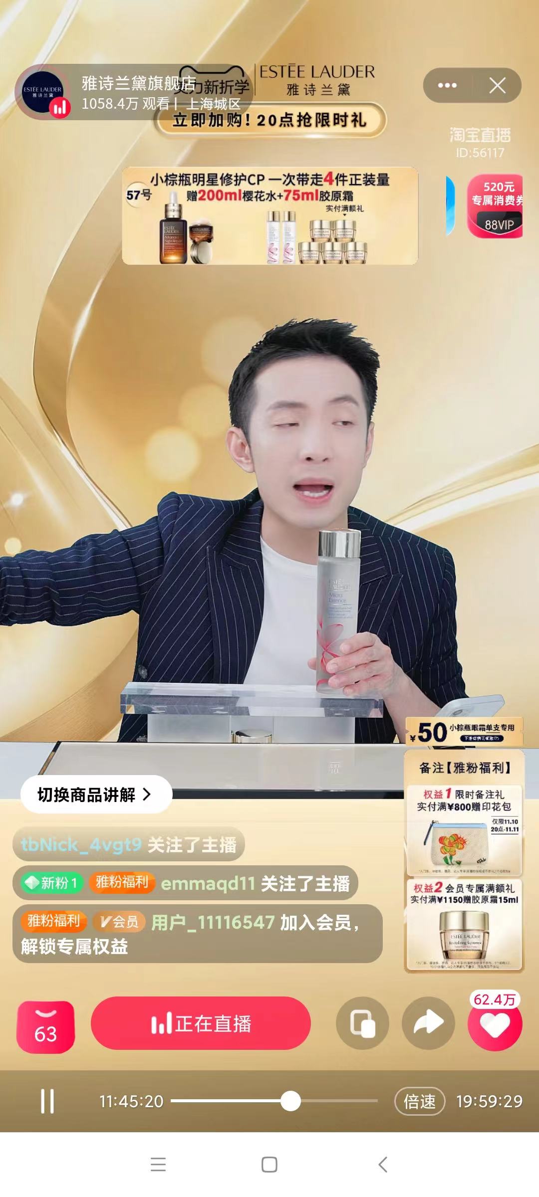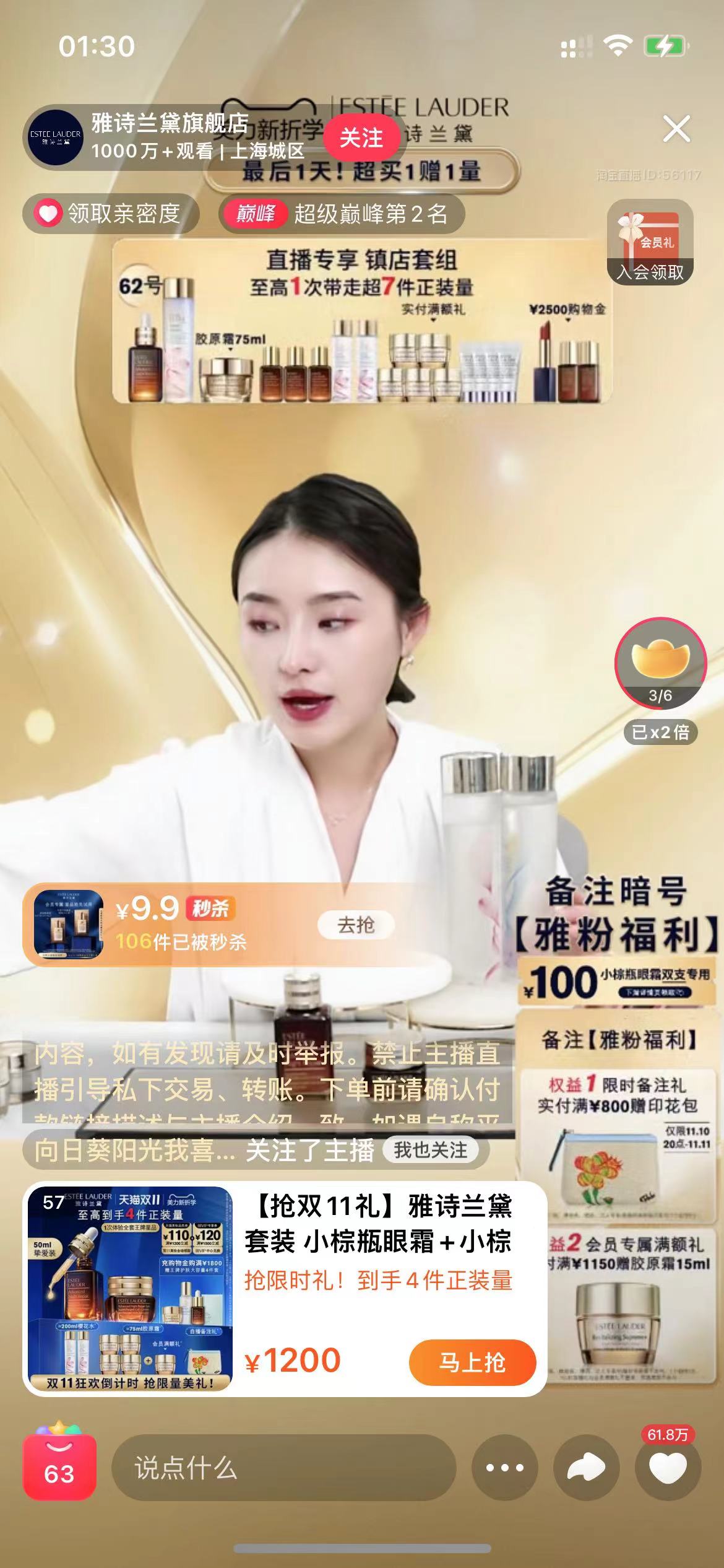 需要特别关注的是,11月11日0点,雅诗兰黛旗舰店淘宝直播间成为全网第一个场观破千万的店播直播间,并且其场观数据已经超过头部主播交个朋友直播间。