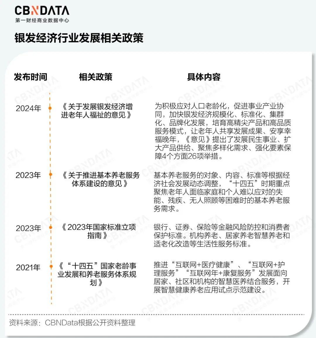 报告中“养老”一词出现13次,且在十大工作任务中,有五项涉及到养老相关的工作,涵盖了养老金融、老年医疗、养老照护、养老服务、养老消费、适老化改造、养老科技、农村养老等多个方面。随着我国人口老龄化趋势加剧,银发经济的政策支持逐渐增强。2024年1月15日,国务院办公厅发布了《关于发展银发经济增进老年人福祉的意见》,提出了四个方面共26项具体措施。这是我国首个以“银发经济”命名的政策文件,因此2024年也被认为是我国银发经济的元年。
