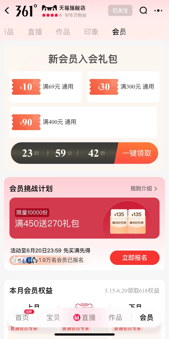 在今年年中的电商618大促之前,361度就已敏锐地捕捉到会员占比对于品牌人群的重要性,避开大促高峰期聚焦错峰引流,在3月份参与了天猫年度会员日活动(以下简称“会员日”)。参与天猫会员日此活动不仅是寻求与消费者更紧密关系的一种具体行动,更是品牌深化会员关系、提升品牌影响力的重要策略。