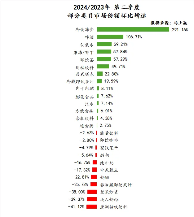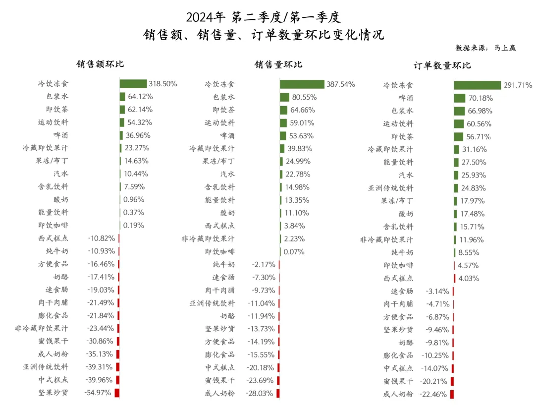 在同比之后,根据不同季节的消费习惯变化情况,我们再观察一下2024Q2/Q1,热点类目在大类中的份额的环比变化情况。