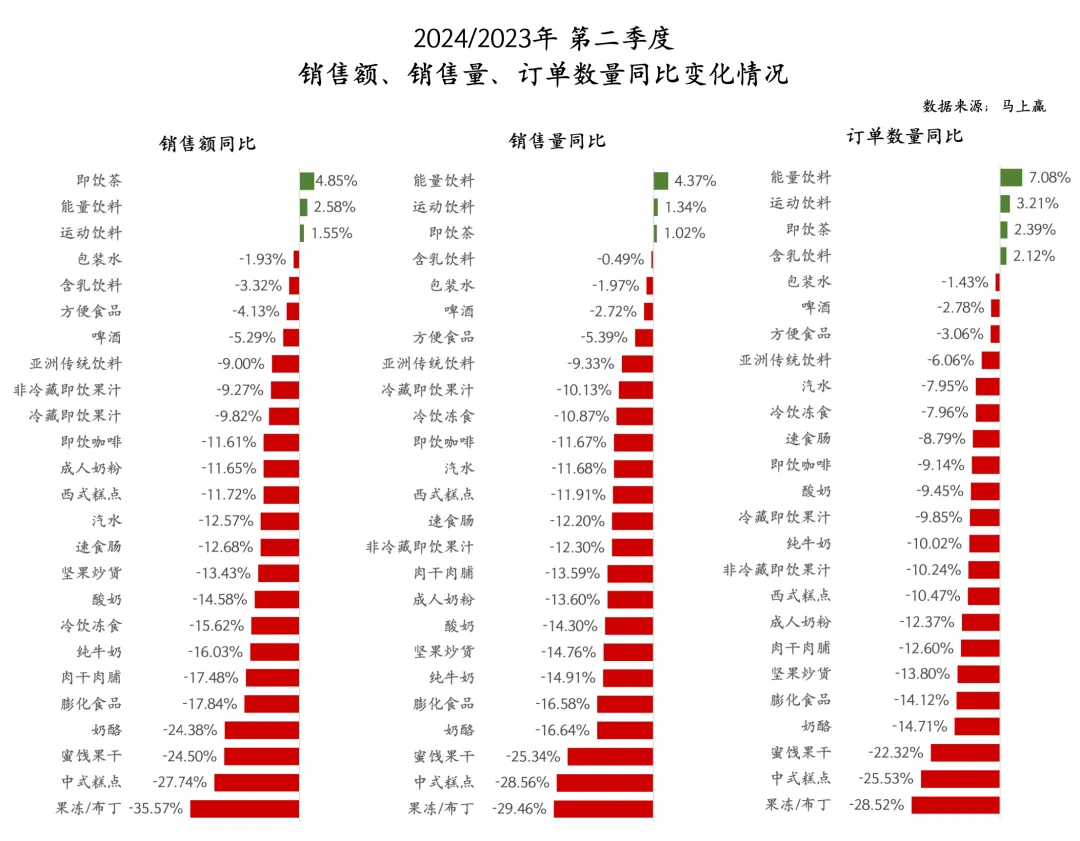 基于包含选定类目的订单去看销售额、销售量与订单量三个指标数据,大部分类目呈现同比下跌的情况。即饮茶、运动饮料、能量饮料、含乳饮料是不多的在三个指标中有增长体现的类目。食品零食类,尤其是较为传统的蜜饯果干、中式糕点、果冻布丁、奶酪、膨化食品等有休闲属性的零食类产品则均面临较严重的下滑。