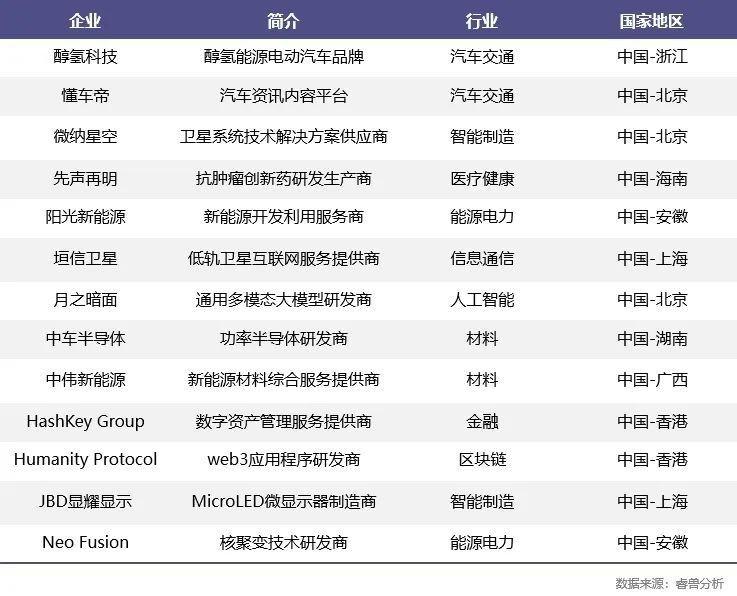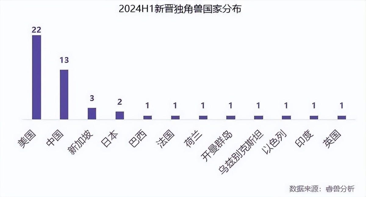 2024H1新晋独角兽分布在全球12个国家,其中美国新增22家(占比45.8%),中国新增13家(占比27.1%),共计35家,中美两国贡献了全球72.9%的新晋独角兽。其次,新加坡新增3家,日本新增2家。