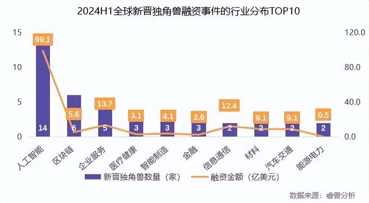 全球新晋独角兽数量同比下降、环比回升。2024H1全球新晋独角兽48家,同比下降15.8%,环比上涨26.3%;美国新晋独角兽22家,同比增加10%,环比增加69.2%;中国新晋独角兽13家,同比下降43.5%,环比增加8.3%。
