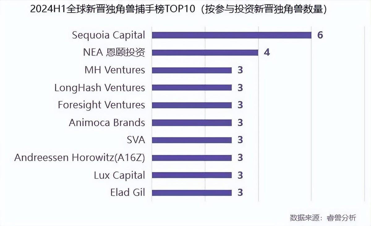 2024H1新晋独角兽的历史投资和独角兽轮次投资中,共有509家投资机构参与其融资事件。其中454家机构参与投资1家独角兽(占比89.2%),55家机构参与投资2家及以上独角兽。Sequoia Capital参投6家独角兽,其次是NEA恩颐投资参投4家独角兽。