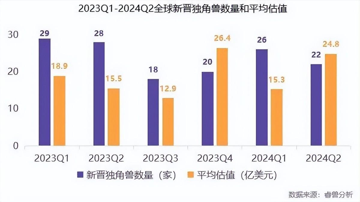 2024H1全球新增48家独角兽企业,同比下降15.8%,环比上涨26.3%,其中2024Q2全球新增独角兽企业22家,同比下降21.4%,环比下降15.4%。2024H1新晋独角兽平均估值19.68亿美元,同比上涨14.3%,环比下降1.7%。2024Q2新晋独角兽平均估值24.8亿美元,同比上涨60%,环比上涨61.9%。