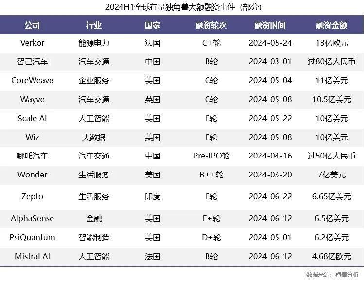 2024H1总体存量独角兽融资事件最多的行业分别为企业服务(17个)、汽车交通(16个)、人工智能(15个)。已披露融资总额排名前4的行业是汽车交通(39.02亿美元)、企业服务(32.10亿美元)、人工智能(28.20亿美元)和能源电力(22.72美元)。能源电力领域Verkor获得过13亿欧元融资,为单笔最高。