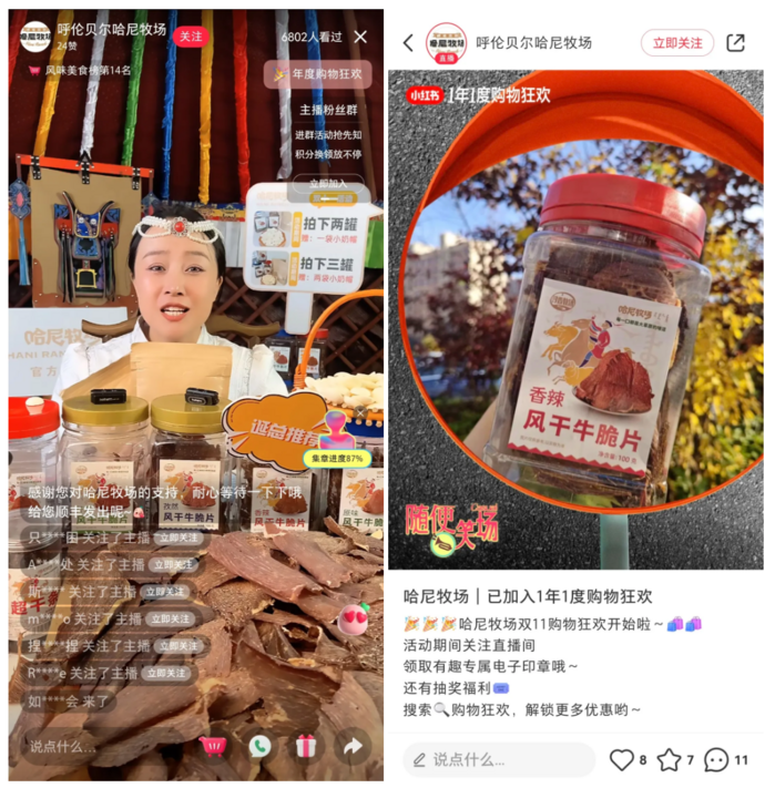 今年,张新盟第一次参加了双11大促。信心来自哈尼牧场的一款新品牛肉脆片零食在小红书上风靡起来,还多了一个代号“牛脆脆”。市场上类似的产品越来越多,但在“牛脆脆”的拉动下,双11期间,哈尼牧场在小红书仍然卖出了超1500万的销售额。