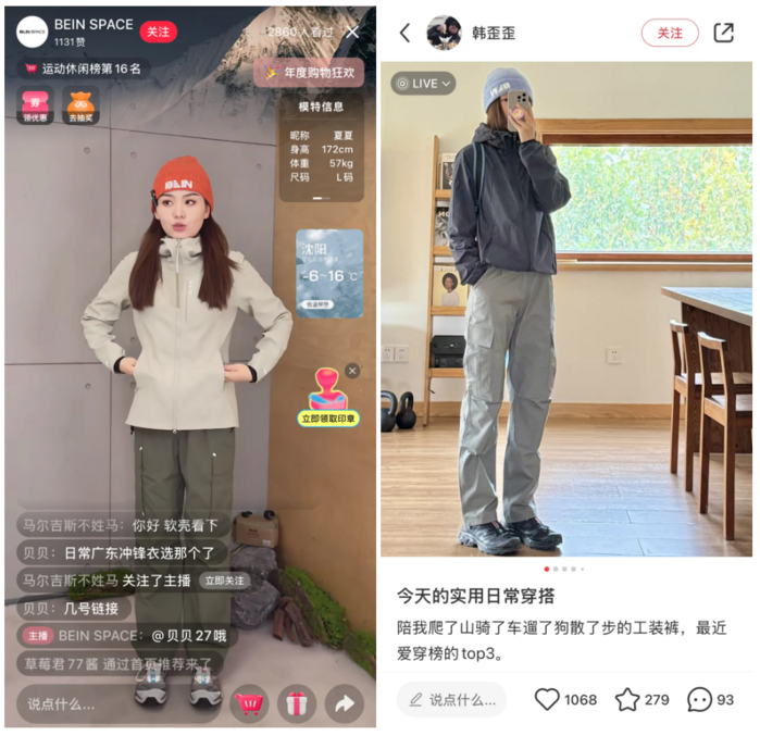 BEINSPACE的小红书直播间(左)用户分享的穿搭笔记(右)