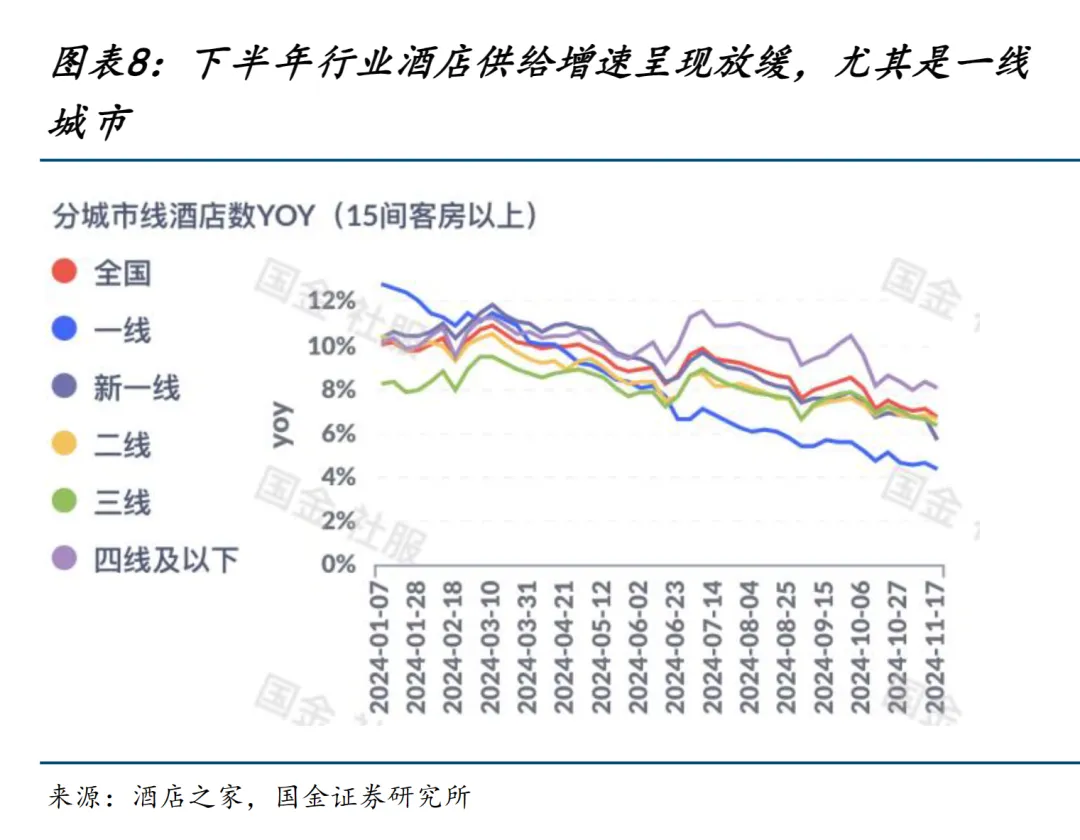 特别是一线城市,酒店供给下滑最为明显,由上半年高点 13%回落至 4.5%。