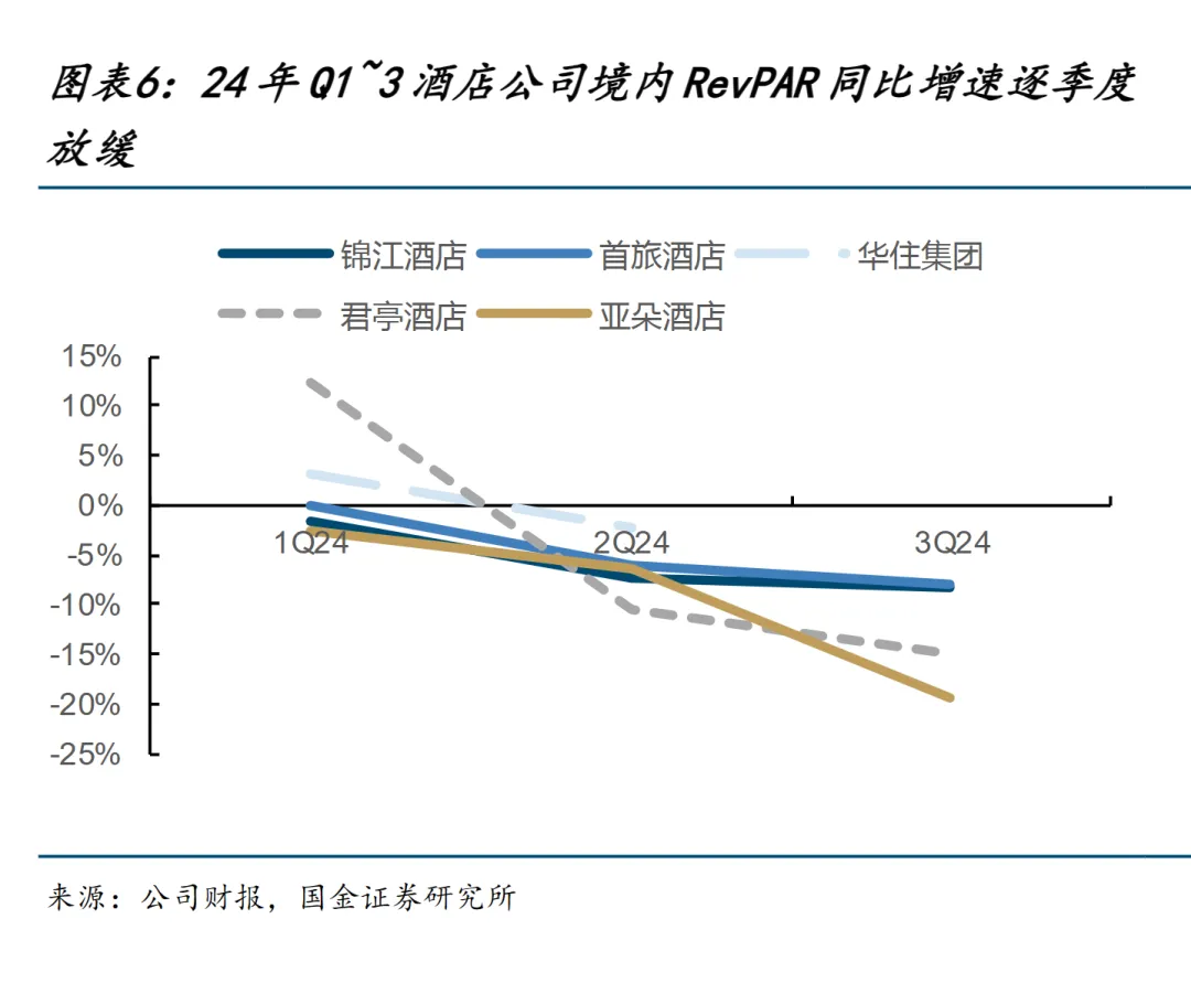 整体来看,各大酒店集团的每间可售房收入(RevPAR)增速表现不佳,从第一季度到第三季度呈现出持续下滑的趋势,并在第三季度触底。