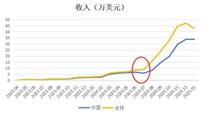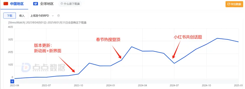 2024 年 7 月,对于 StressWatch 是一个转折点。一是小红书合作又拉了一波流量,另一个是下载和收入两条线对比,在 2024 年 7 月份之前,不论下载曲线如何“波澜壮阔”,收入曲线一直“稳如老狗”,而直到 7 月份,收入才开始真正起飞,一路增长并在 10 月反超成为国内赛道 Top1。