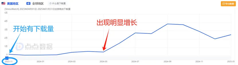 2024 年 5 月,StressWatch 在海外的投广力度加大,其全球下载量在国内下载量减少的情况下反而出现小幅增长。但总体来说全球数据和国内差别并不大,StressWatch 真正迎来明显变化是在 2024 年 7 月。