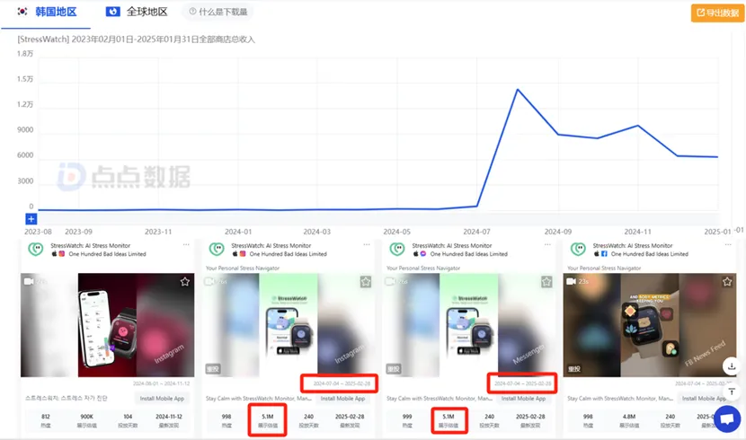 StressWatch 在韩国上线以来的收入变化与在韩广告投放情况,后续还专门出了韩语广告,展示估值最高达 220 万|图源广大大、点点数据