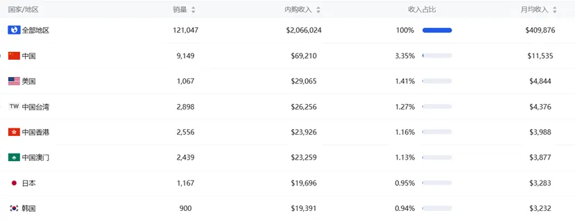 另外也是在 7 月份,全球和中国两条线终于开始拉开了一定距离,也就是说在海外市场开始产生一些下载量和收入。而在海外市场中,表现最亮眼的,是韩国。