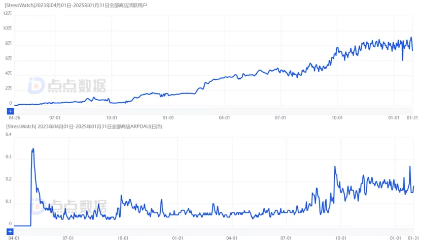 不断拓展海外市场和 bug 修复,导致 2024 年下半年海外 DAU 和 ARPDAU 都开始出现上涨(上线初期用户数量较少,故 ARPDAU 出现超高峰值)