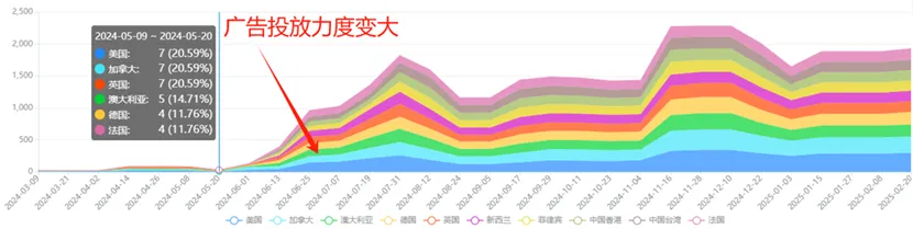 通过对比国内数据和全球数据的对比不难发现,StressWatch 初期的成绩全都来自国内市场。2023 年 11 月开始投放海外广告(广大大上可查广告最早发布时间),当月也开始出现海外下载。