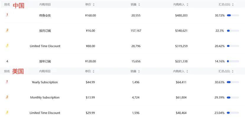 近半年 StressWatch 在中国和美国的内购项目排名,美国为近半年内购项目购买量最大的海外国家,故选其作为海外市场参照。|图源点点数据