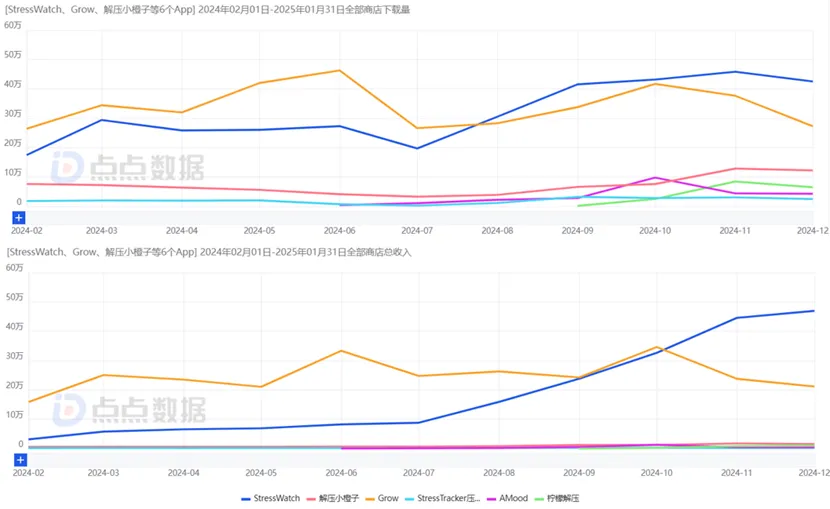 声量较高的6款压力测试 App 的近一年 iOS 端全球下载量和收入,两图上方蓝线为 StressWatch,黄线为 Grow | 图源点点数据